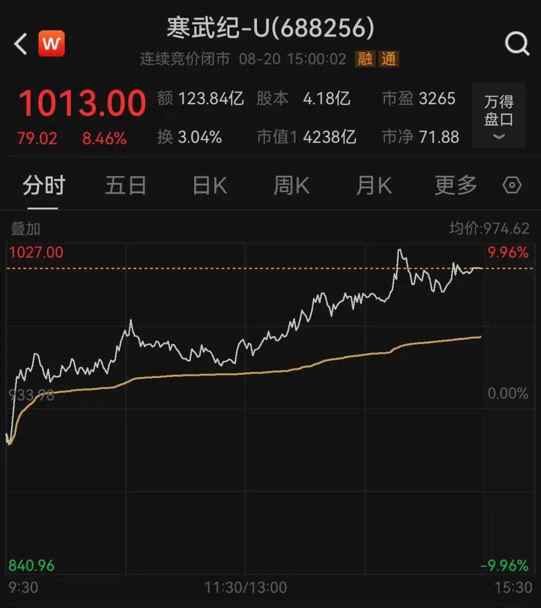 寒武纪午后大涨逾8%,股价再度突破1000元,成为目前市场上第二只千元股。