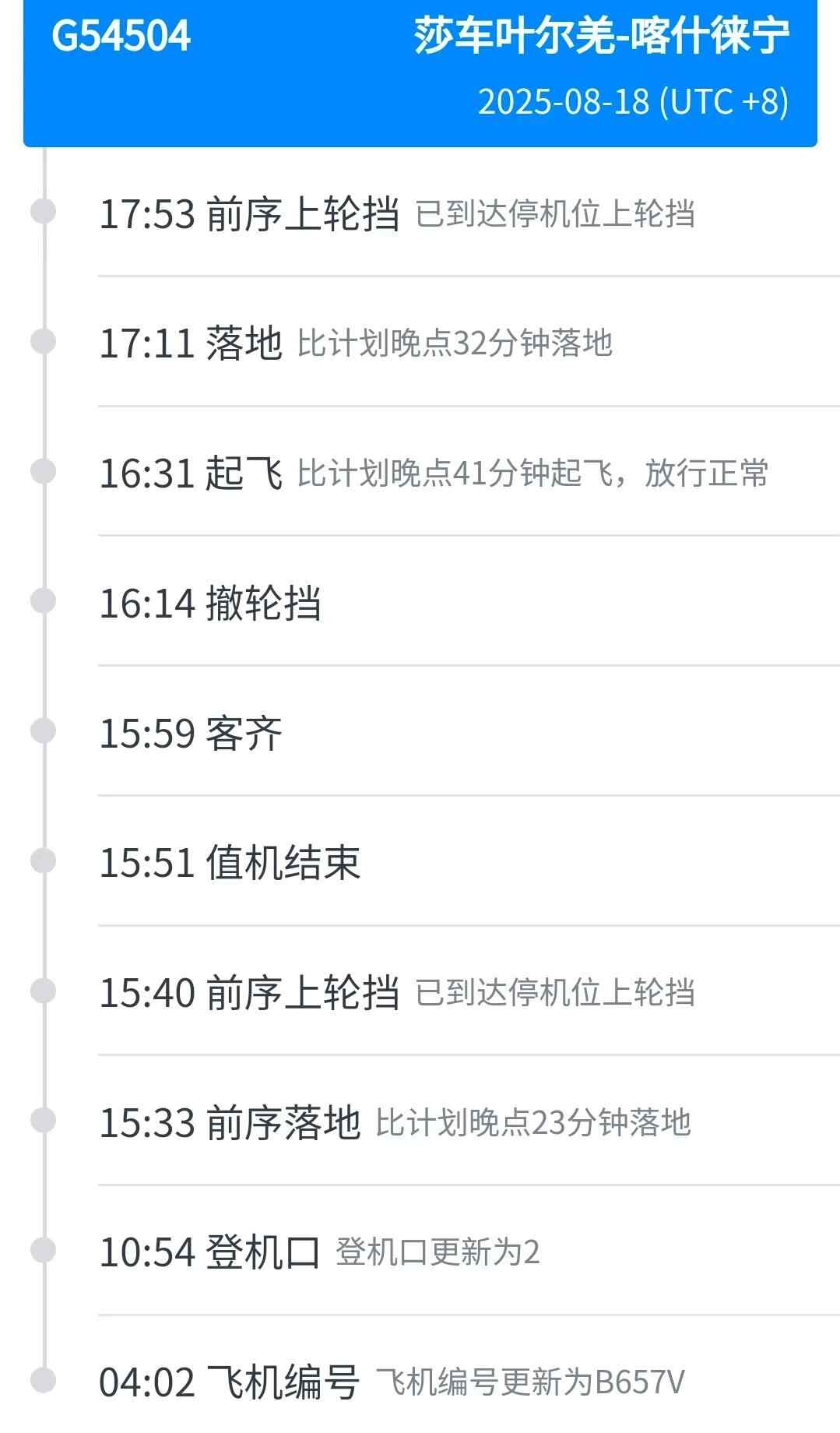 该航班原计划于18日15时50分从新疆莎车叶尔羌机场起飞,于当日16时40分到达喀什徕宁机场,但后来该航班返航后取消。该航班的执飞飞机系中国商飞C909客机,飞机编号为B657V。
