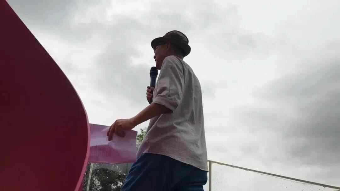雨还是下了。一开始大家不愿意走,但雨越来越大,陈德道遂指挥大家把塑料凳搬到旁边屋檐下,旁人则抄起雨伞过去,给朗读者撑持起来。