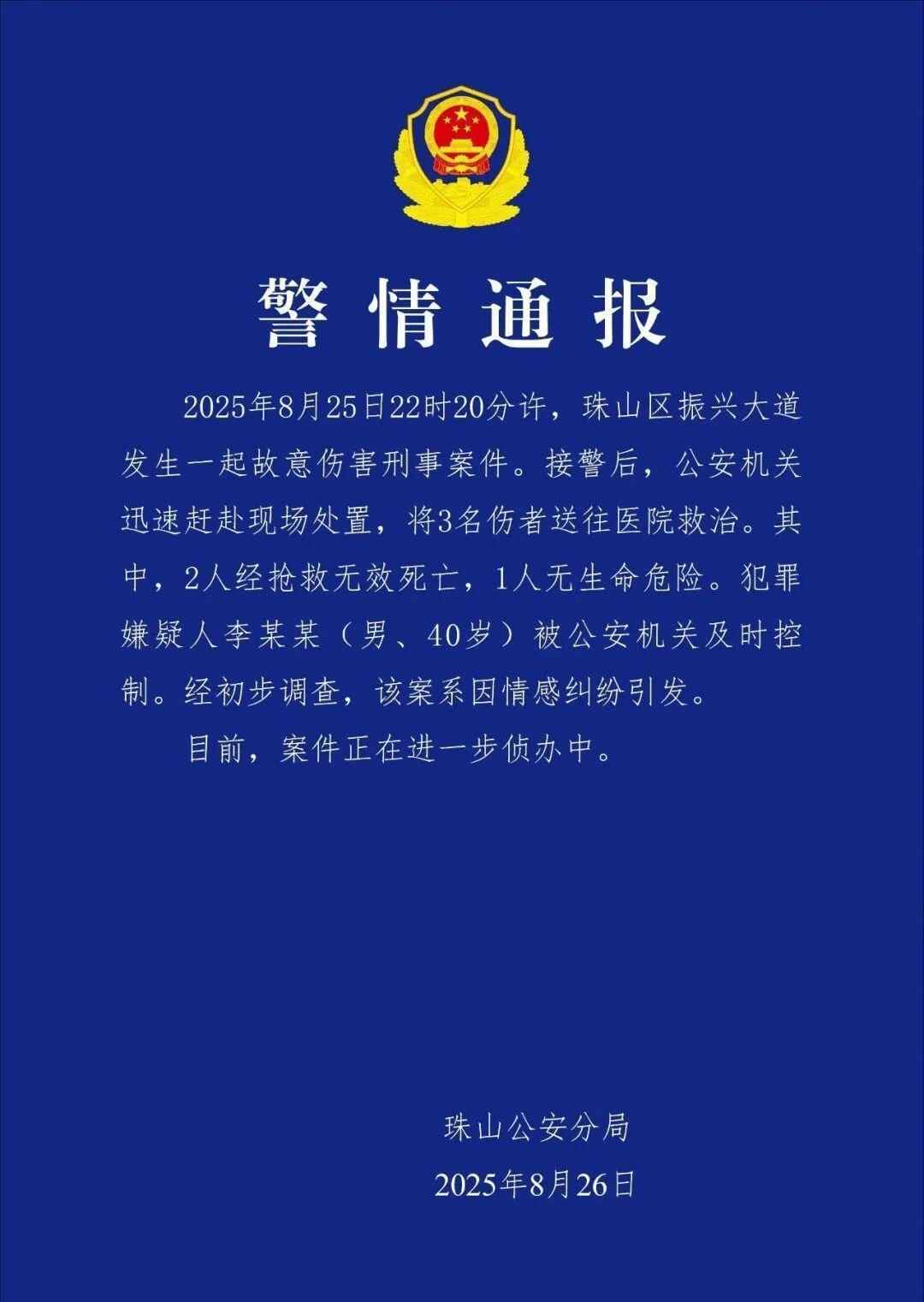 其中,2人经抢救无效死亡,1人无生命危险。犯罪嫌疑人李某某(男、40岁)被公安机关及时控制。经初步调查,该案系因情感纠纷引发。