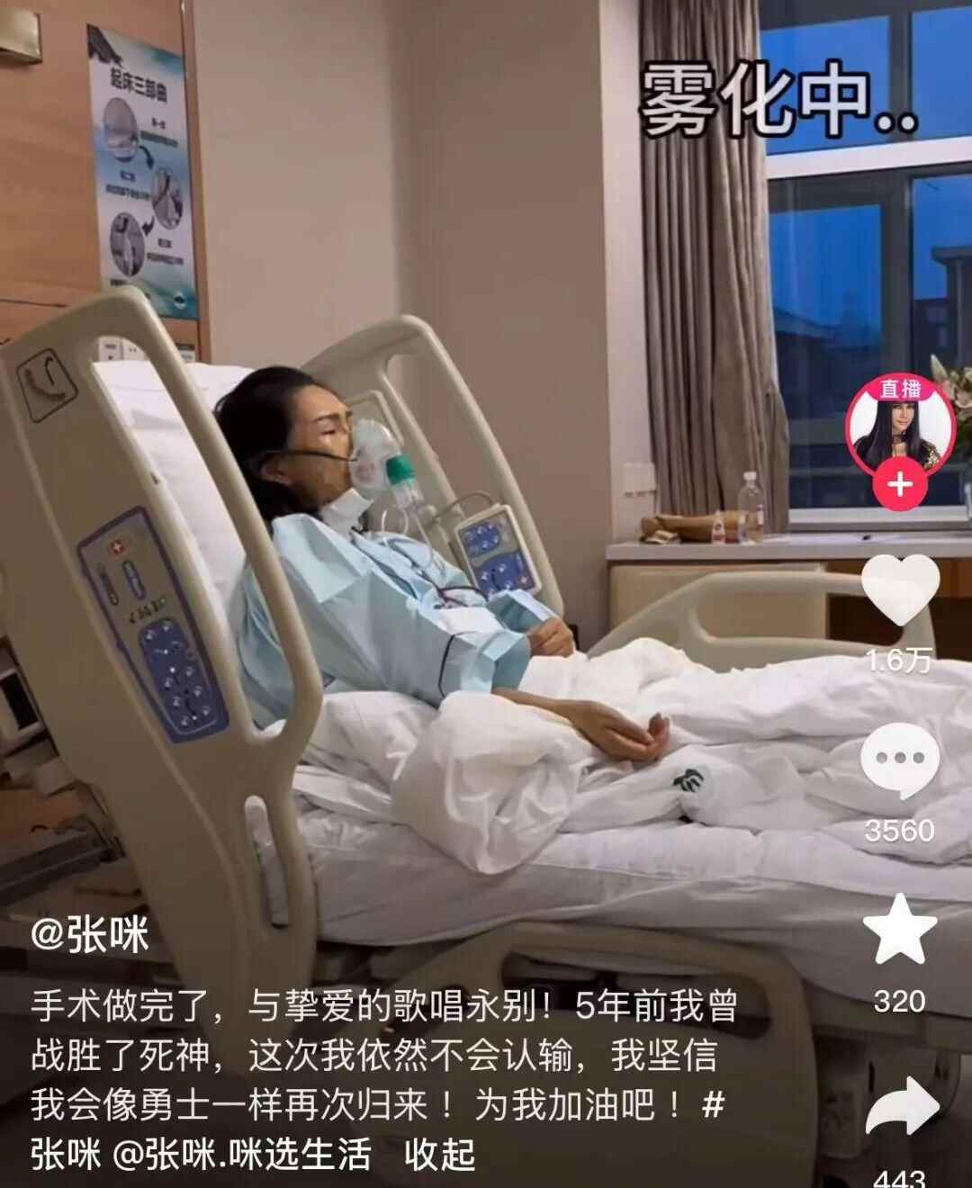 同年11月26日,张咪在个人社交账号发视频向大家报平安。据悉,经过6个小时,张咪手术顺利,一切都好。不过,张咪也表示,自己将与挚爱的歌唱永别。