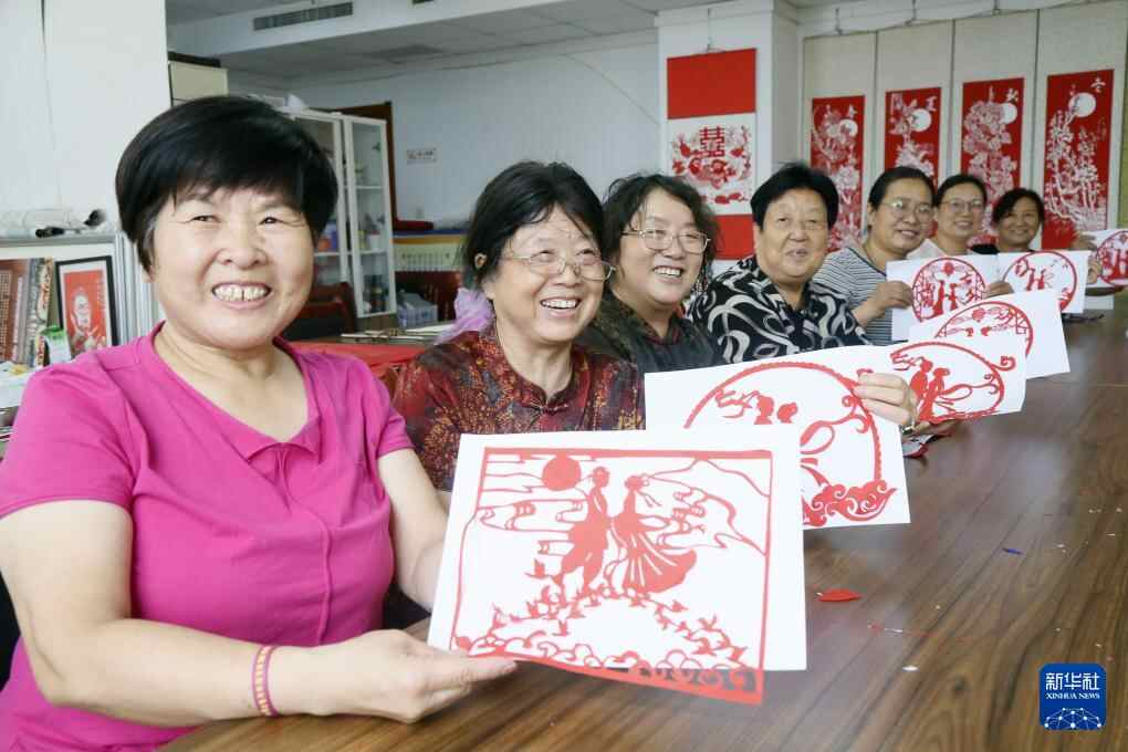 8月26日,在河南省洛阳市汝阳县人民文化馆,剪纸艺人展示七夕主题剪纸作品。