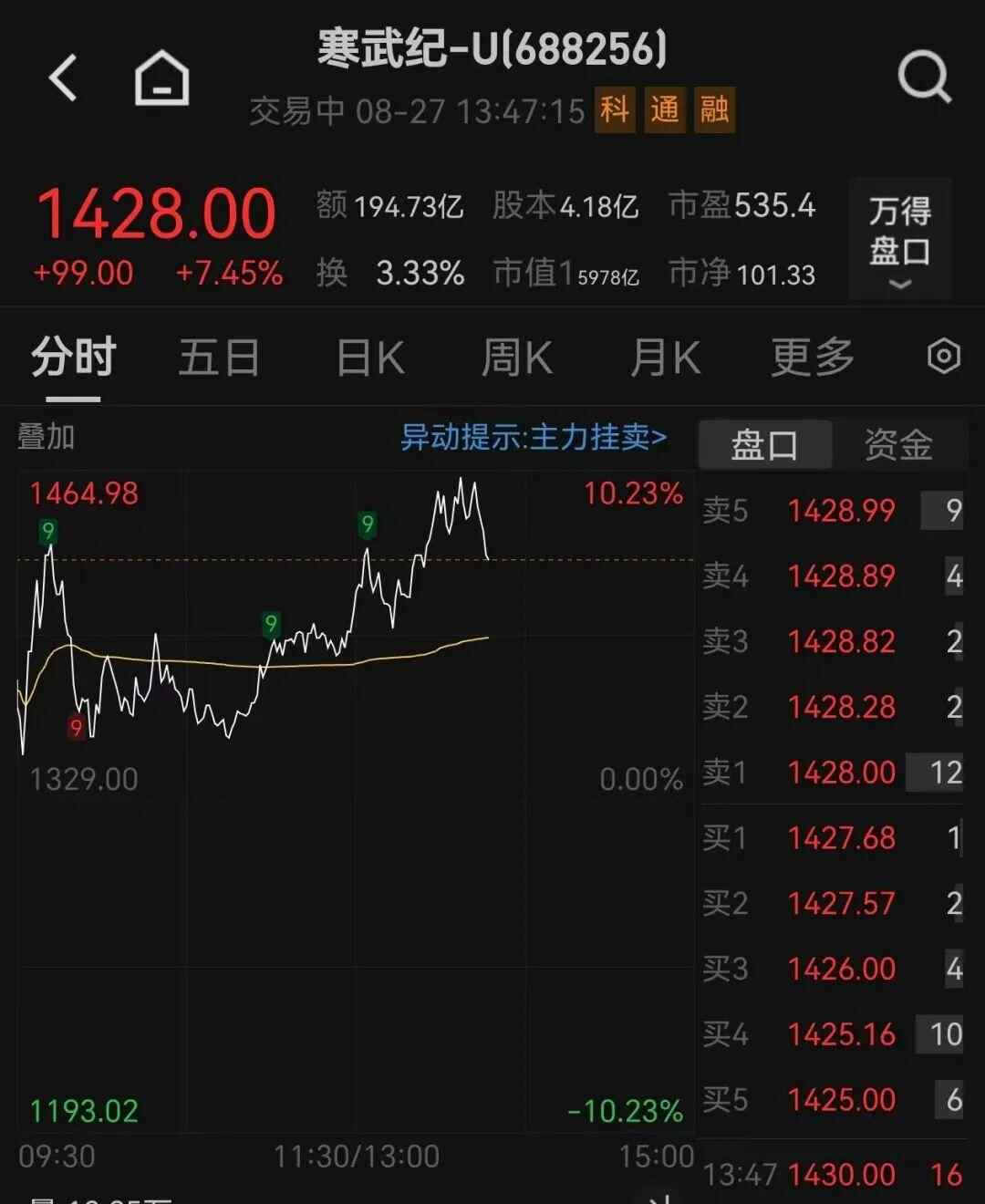 8月27日,寒武纪(688256.SH)开盘大涨。盘中拉升涨近10%,以1461元的股价一度超越贵州茅台成为新“股王”。