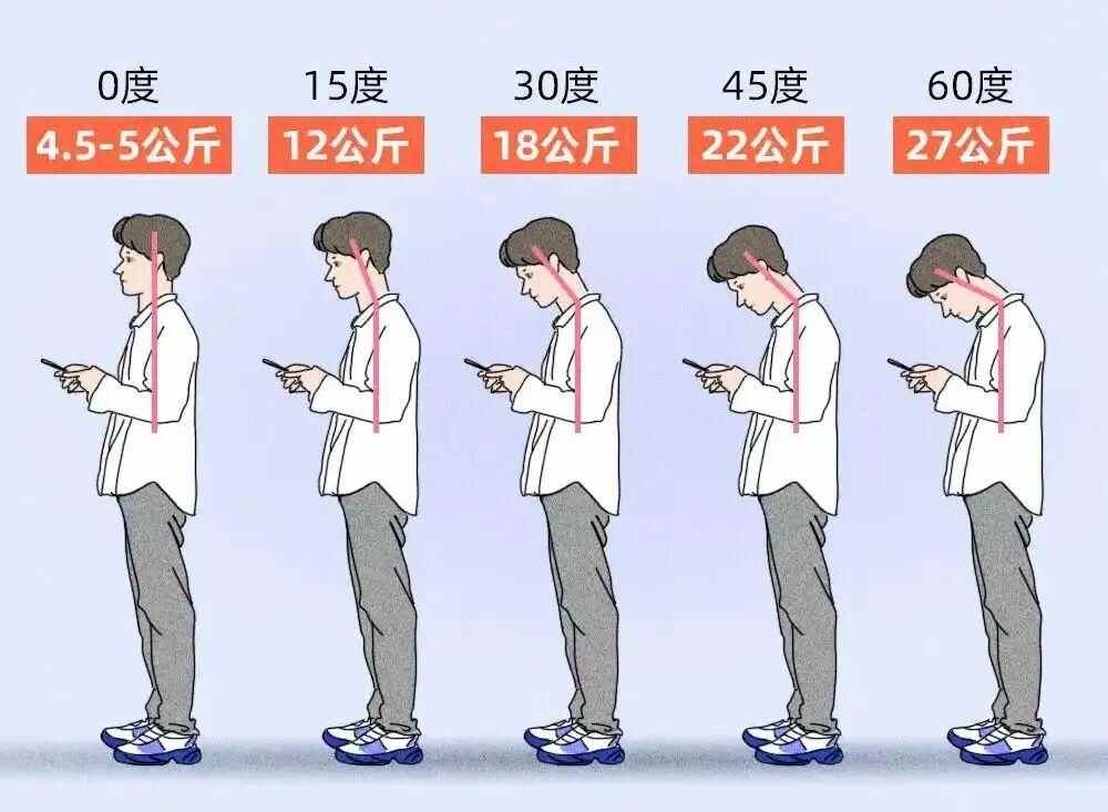调查显示,我国20岁至40岁青壮年颈椎病患病率高达59.1%。在青壮年中出现的颈椎反弓、颈椎病、腰椎间盘突出,与久坐、低头用手机直接相关。而低头玩手机会让颈椎承受约27公斤的重压,比一个7岁小孩还重。