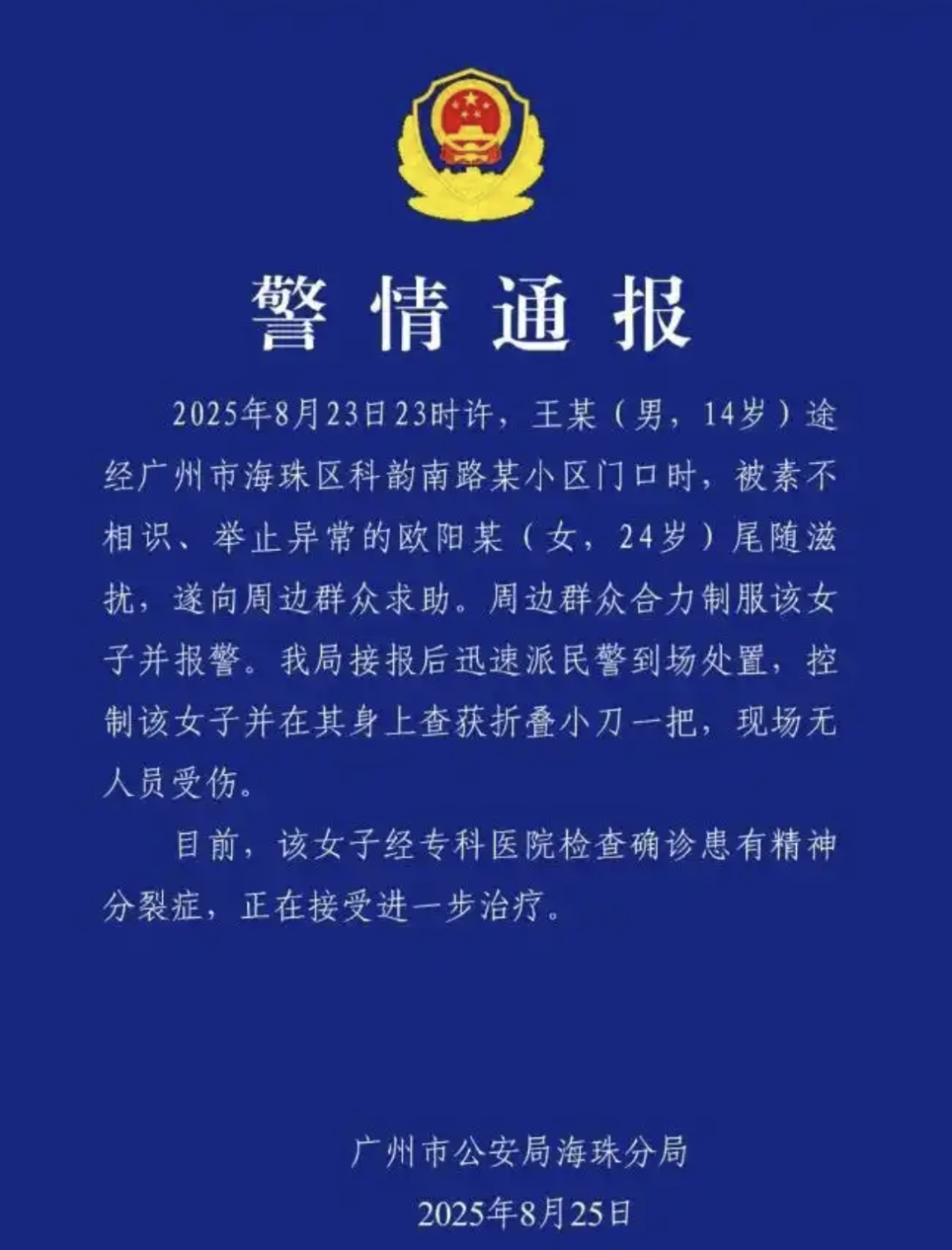 8月25日18时45分许,广州市公安局海珠分局发布通报称,涉事女子被当场控制,为精神分裂症患者,已送医治疗,现场无人员受伤。