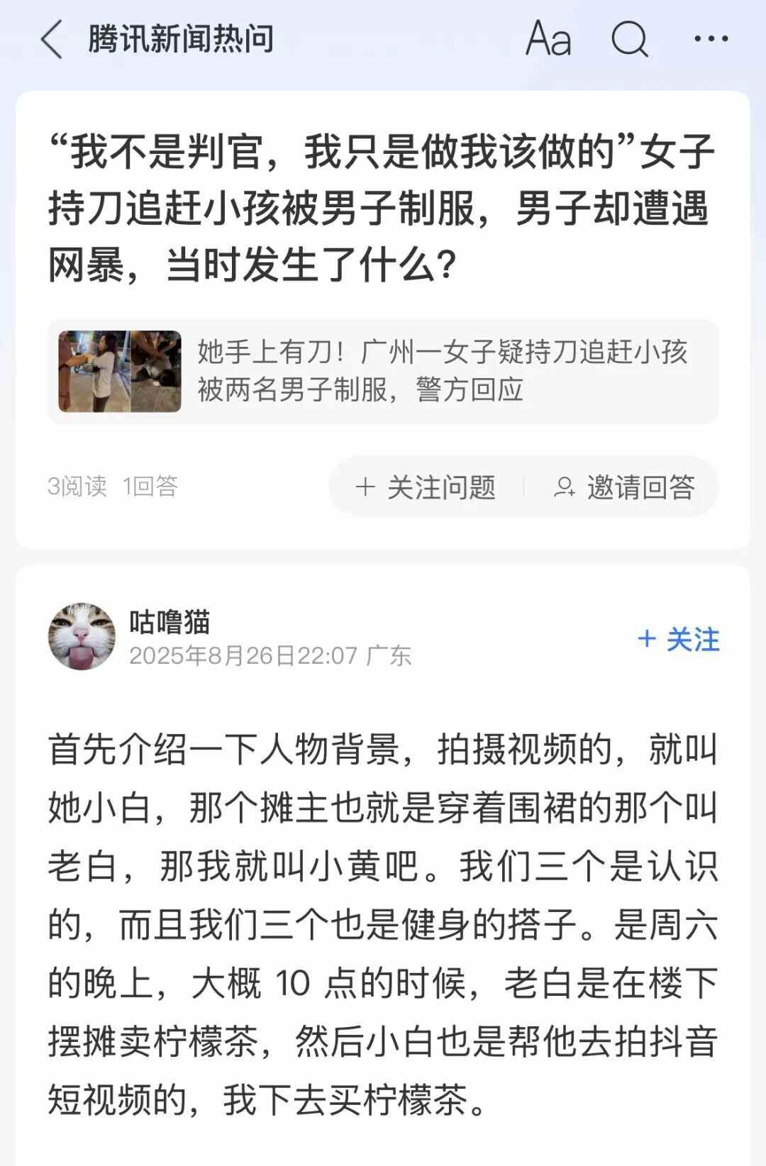 8月26日,制止持刀女子的当事人之一小黄(化名)在腾讯新闻热问发声。小黄称,当时制止持刀女子的共有三人,分别是他和小白(视频拍摄者)以及老白(均为化名)。他告诉记者,他们三人系邻居,都住在一个小区,是经常一起健身的搭子。事发当天是老白摆摊卖柠檬茶,小白过去帮忙拍摄视频宣传,小黄下楼购买柠檬茶。