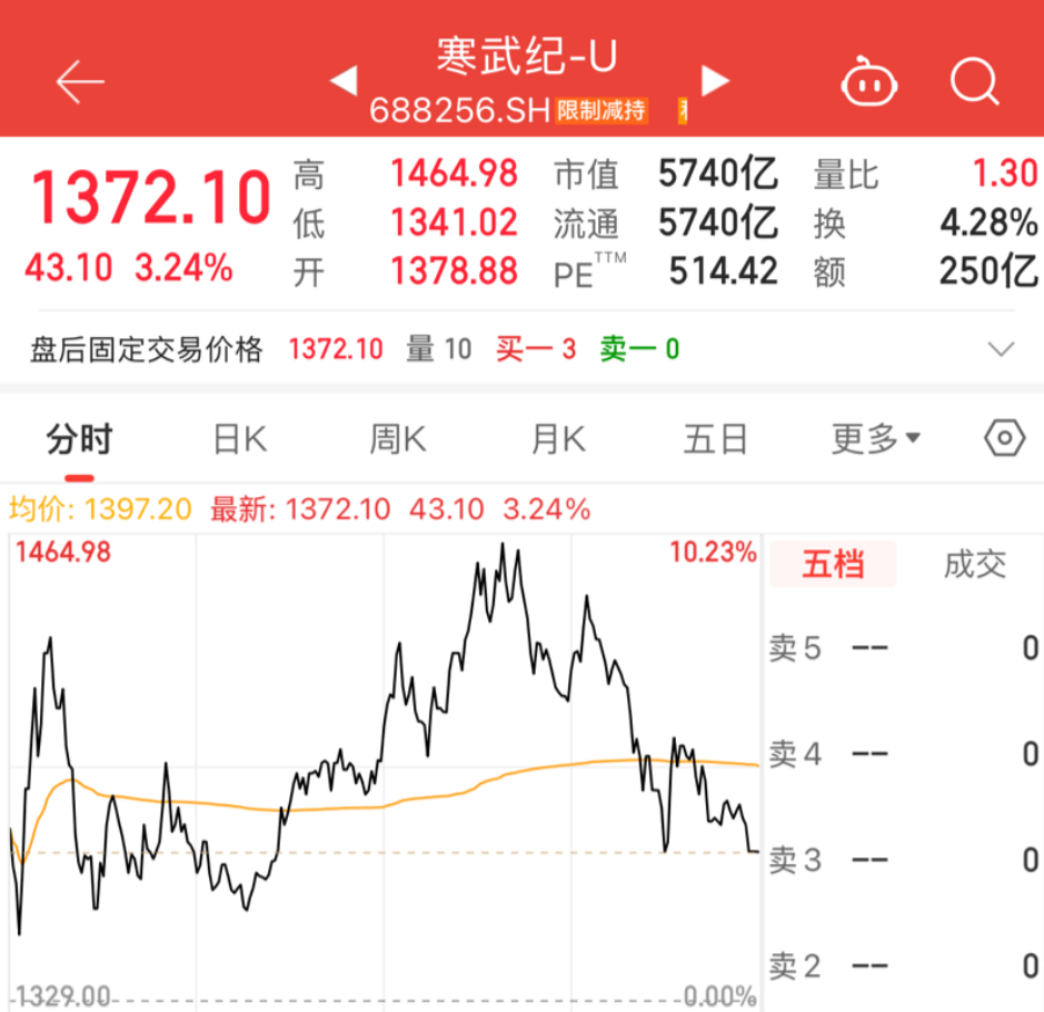“寒王”短暂登顶后,市场多空博弈更加激烈,临近尾盘寒武纪涨幅收敛,以1372.10元报收,单日涨幅3.24%,总市值达到5740亿元。同日贵州茅台收盘价为1448元/股,此时A股“股王”易主仅差75.45元。这个成立仅9年的AI芯片企业,在短短一个月内股价翻番,正以“寒王”之姿向A股“股王”贵州茅台发起挑战,成为本轮A股牛市最吸睛的个股。
