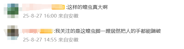 有网友感慨这种蝗虫确实大,也有网友惊讶于这种蝗虫蹬一脚居然能把人的手划破。