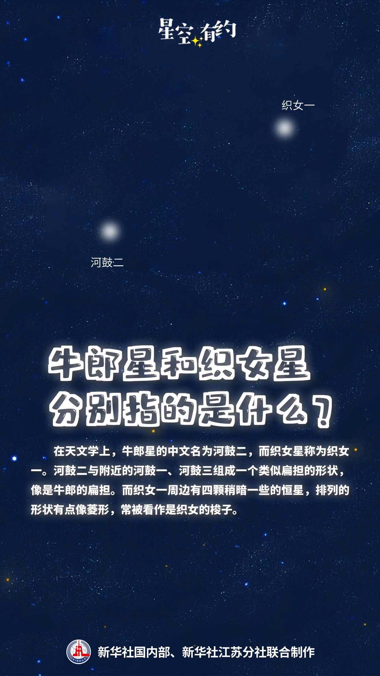 中国科学院紫金山天文台科普主管王科超说,在天文学上,代表牛郎、织女的天体分别是牛郎星和织女星。牛郎星的中文名为河鼓二,织女星为织女一,它们分别是天鹰座和天琴座的亮星。河鼓二与附近的河鼓一、河鼓三组成一个类似扁担的形状,像是牛郎的扁担。而织女一周边有四颗稍暗一些的恒星,排列的形状有点像菱形,常被看作是织女的梭子。