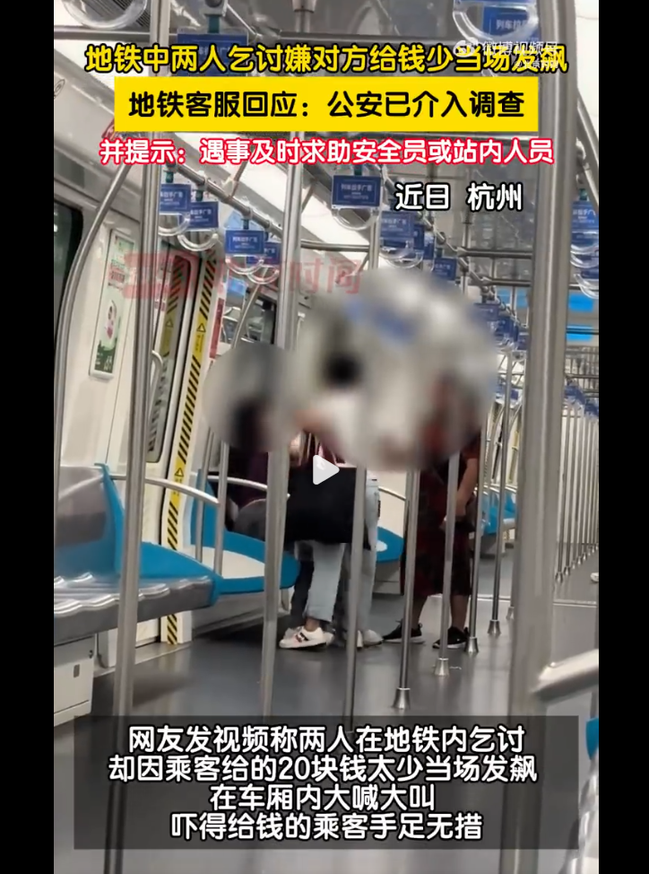 8月23日22时许,杭州地铁5号线南湖东站车厢内发生一起纠纷,两名中年女性疑行乞20元嫌少向乘客叫嚷。