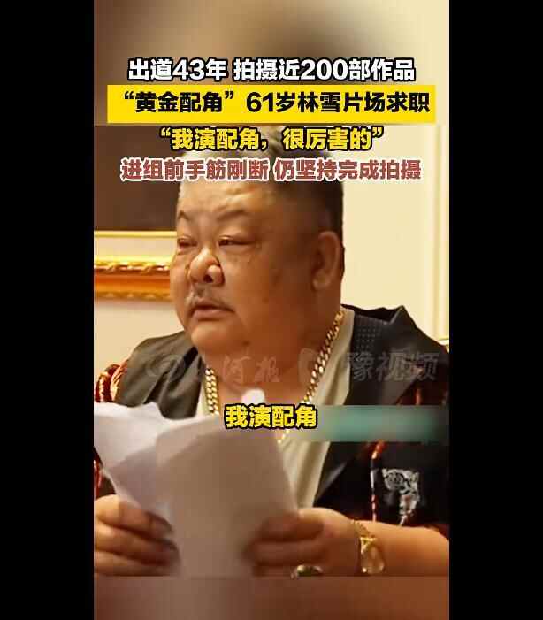 近日,电影《脱缰者也》杀青,被称为“黄金配角”的林雪在片场为自己的下部戏积极求职:“再找我啊,我演配角,很厉害的” 。林雪进组前手筋刚断,仍坚持完成拍摄。他出道43年,拍摄近200部作品。