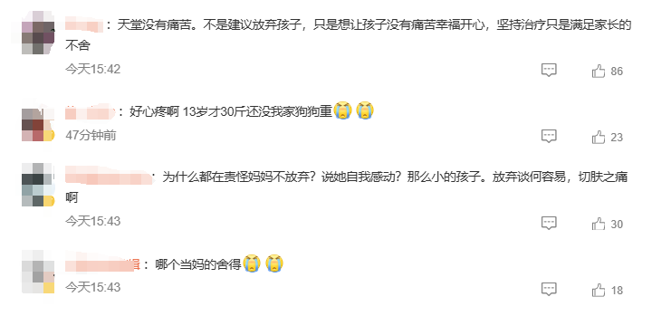 评论区里有网友表示,家长应该让孩子减少痛苦,做出选择。也有网友表示妈妈很难放弃自己的孩子,“切肤之痛,哪个当妈的舍得”。
