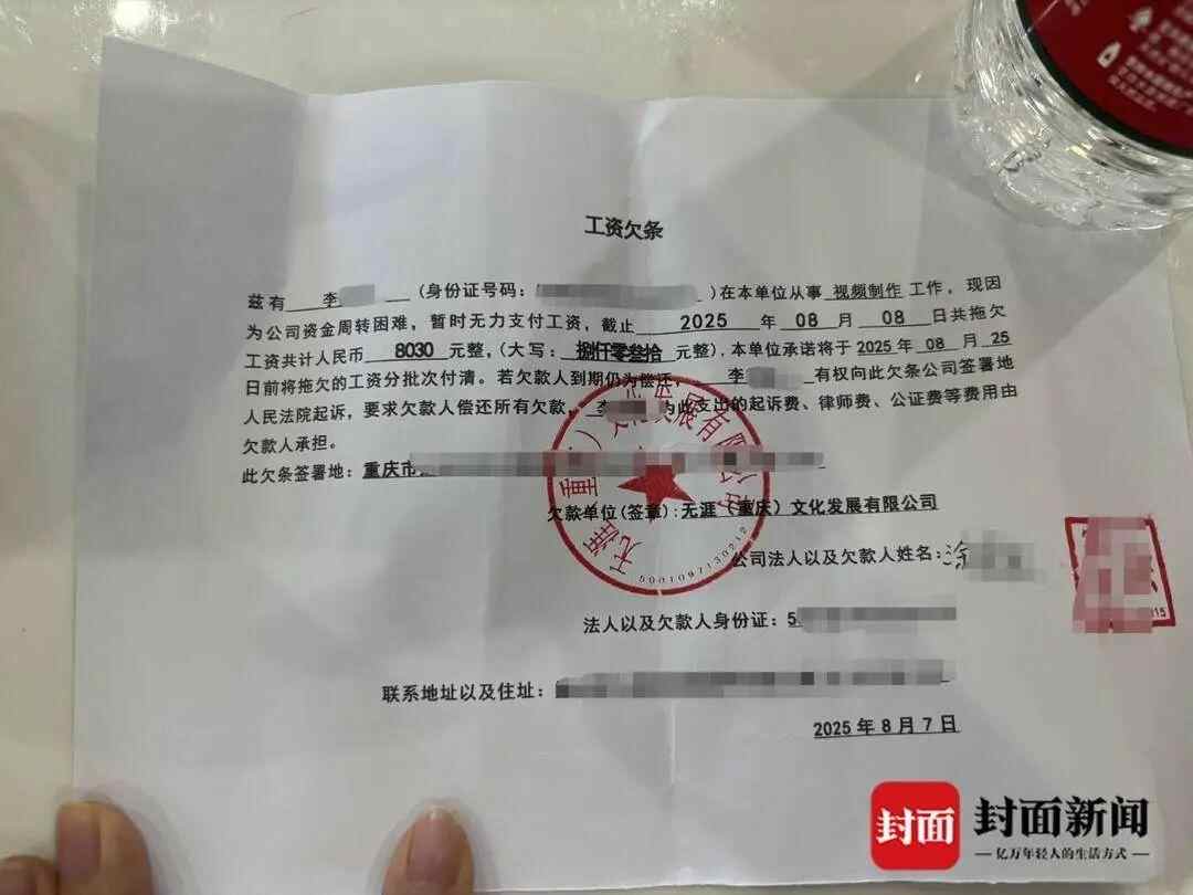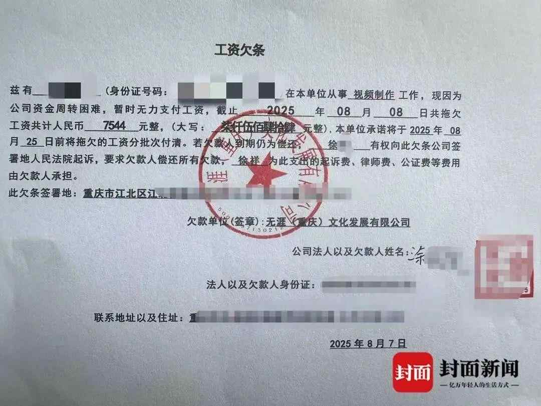 8月26日,重庆移通学院和长江师范学院两名2025届毕业生向封面新闻“云投诉”称,他们在位于重庆市江北区的无涯(重庆)文化发展有限公司工作了40多天,公司却未按签订的合同发放工资。经过多次追讨,公司负责人向他们出具了书面欠条,并承诺于8月25日前结清拖欠的工资。