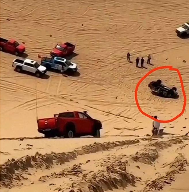 网传视频显示,一辆越野车从沙坡上翻滚而下。另一段视频中,两名男子躺在地上,周围有许多汽车碎片, 一黑衣男子手捂着头,头上有鲜血流下。另一名白衣男子趴在一男子腿上,背部衣服上有许多血迹。