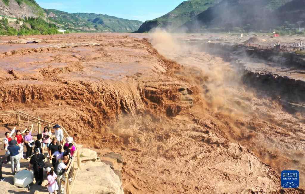 8月22日,游客在山西省吉县黄河壶口瀑布景区赏景游玩(无人机照片)。