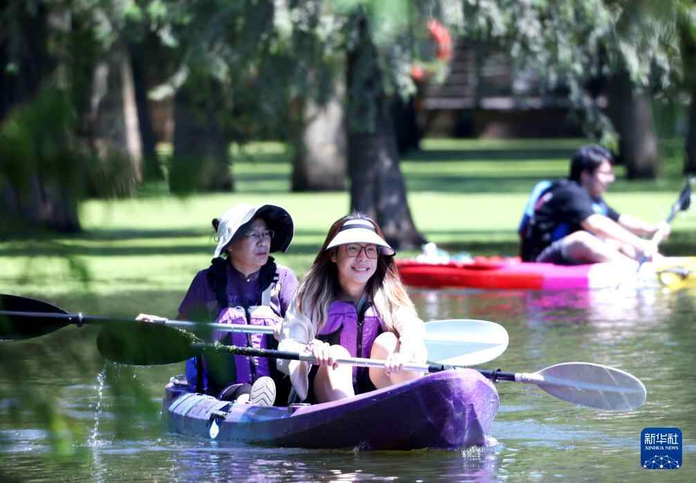 8月24日,游客乘坐皮划艇在浙江省杭州市临安区青山湖水上森林漫游。