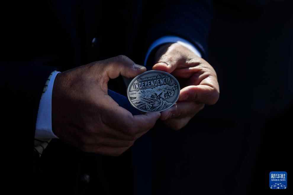8月25日,在乌拉圭南部城市佛罗里达举行的乌拉圭宣告独立200周年纪念活动上,一名参加者展示独立200周年的纪念章。