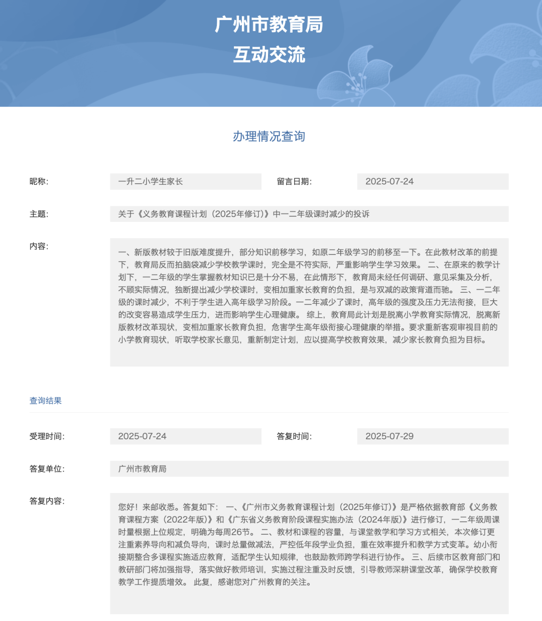 南都N视频记者在广州市教育局官网“局长信箱”栏目中看到,一名自称是升入小学二年级的学生家长表示,在小学新版教材难度提升、部分知识前移学习的前提下,减少低年级教学课时不符合实际,该家长认为将严重影响学生学习效果,且减少学校课时是变相加重家长教育的负担,与“双减”政策背道而驰。此外,该家长还提到,低年级课时减少不利于学生衔接高年级阶段的学习强度和压力,巨大的改变容易造成学生压力,进而影响学生心理健康。
