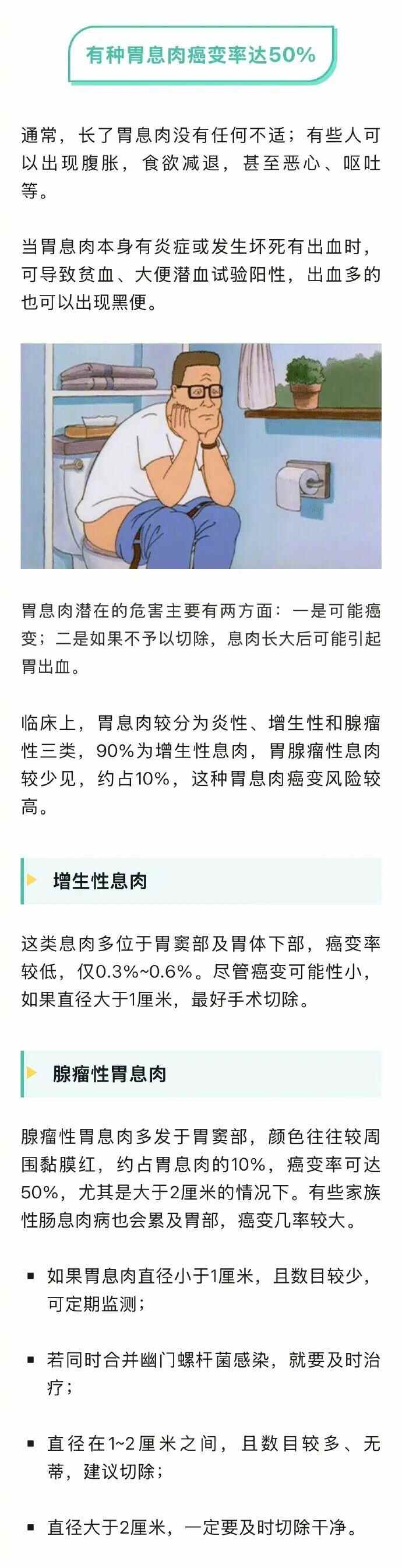 检查发现胃息肉不必恐慌,虽然息肉被认为是癌前病变,但癌前病变≠癌,大部分胃息肉都是良性的,可以相伴终生,只有部分腺瘤性息肉才会癌变,而且也不是100%。