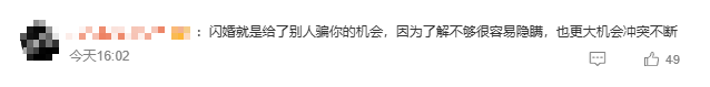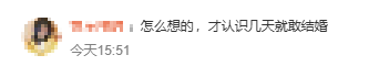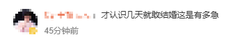 对此,不少网友表示不理解,认识几天就敢结婚。高赞网友表示,闪婚的话不够了解对方,对方很容易隐瞒事情,也更大机会发生冲突。