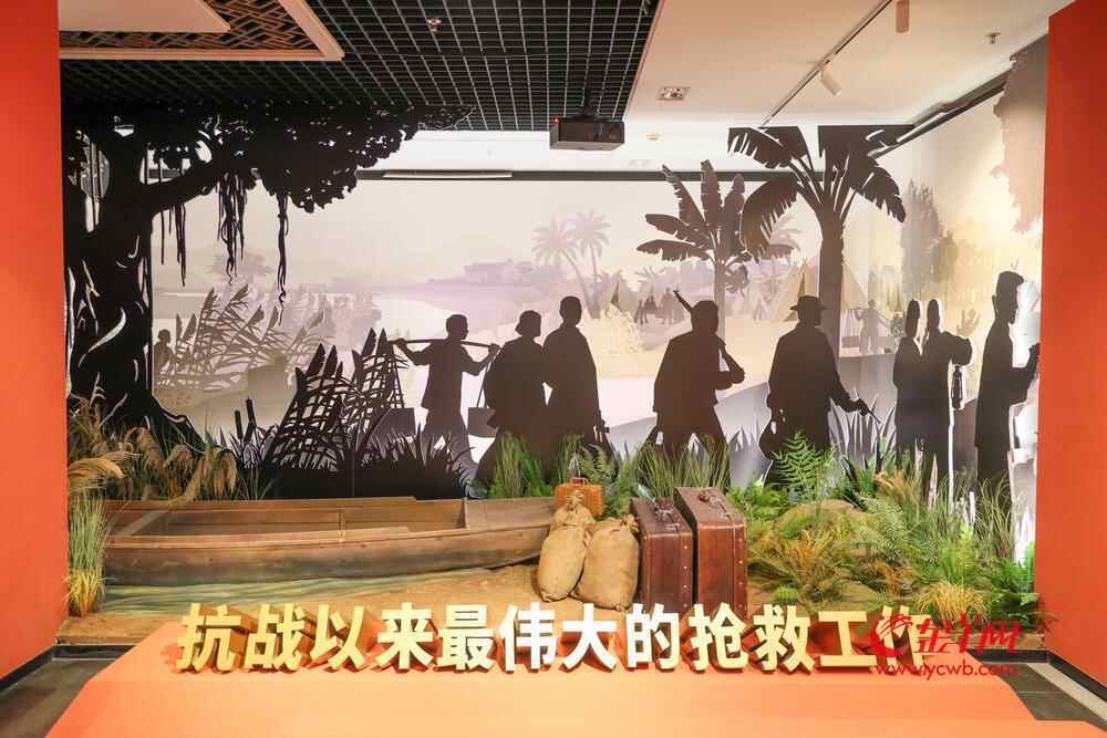 提取东江游击队护送文化人士的历史照片剪影,配合光影装置,还原香港秘密大营救场景。