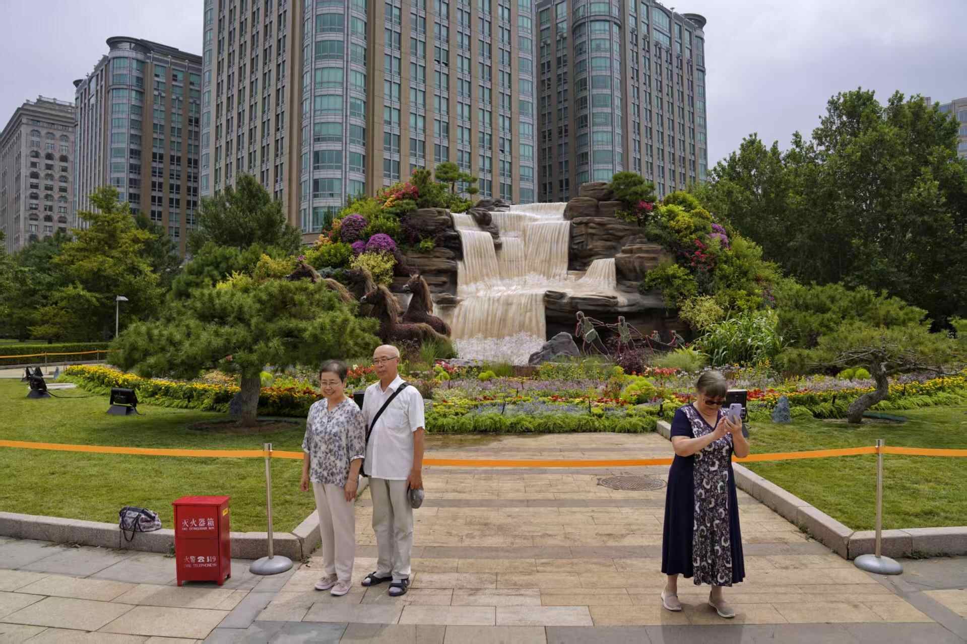 西单东北角——“繁荣发展”花坛以科技工作者、工人、农民、警察、医师、教师、学生等为中心,展示了花开盛世、生机盎然的繁荣发展景象,寓意共建共治共享,以新发展理念为引领推动高质量发展。花坛顶高8.5米。
