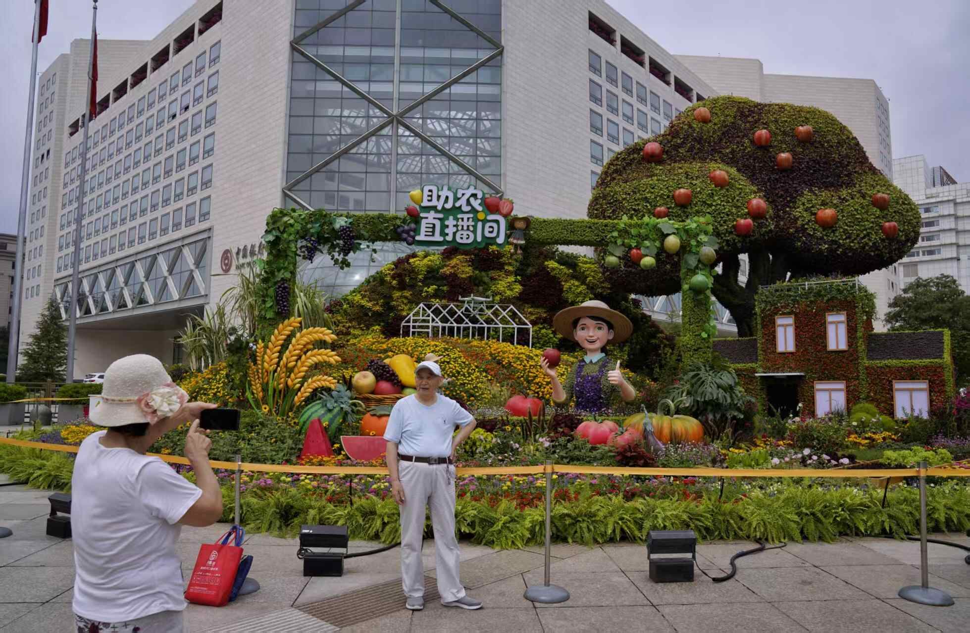 西单西北角——“乡村振兴”花坛以喜庆丰收的花园式新农村幸福生活为场景,谱写生态宜居、和谐稳定、群众安居乐业的中国特色社会主义乡村振兴新篇章。花坛顶高8.5米。