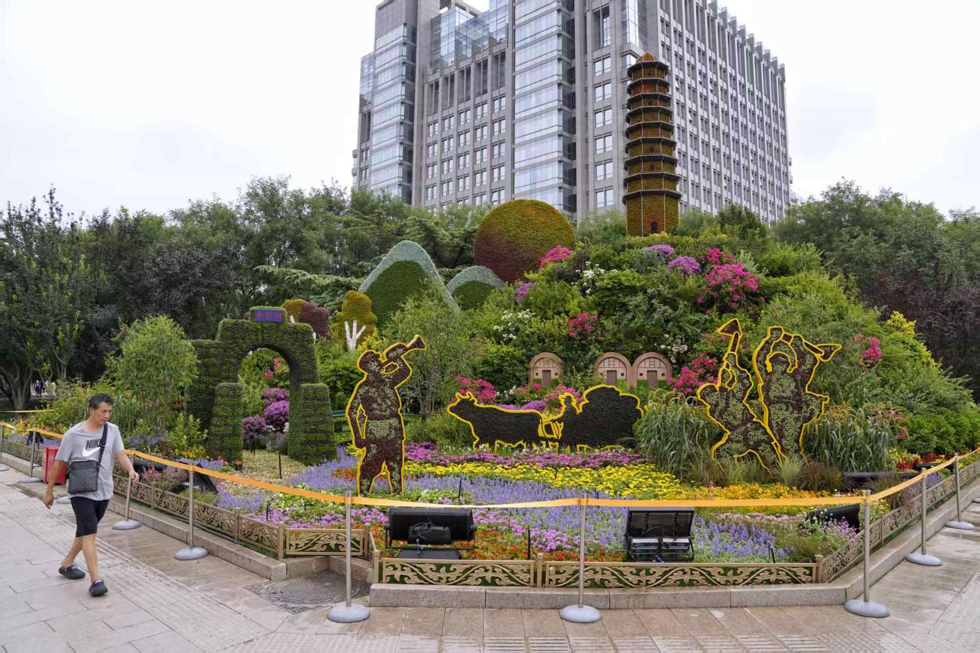 西单西南角——“绿色生活”花坛以蓝绿交织的生态家园为背景,落实“绿化、彩化、立体化”的建设理念,配以休闲、露营、健身等场景,寓意走可持续的绿色发展之路,建设人与自然和谐共生的现代化新图景。花坛顶高8.5米。