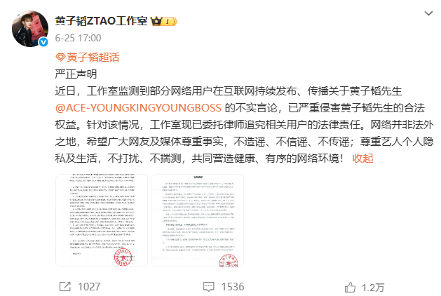 近日,工作室监测到部分网络用户在互联网持续发布、传播关于黄子韬先生的不实言论,已严重侵害黄子韬先生的合法权益。