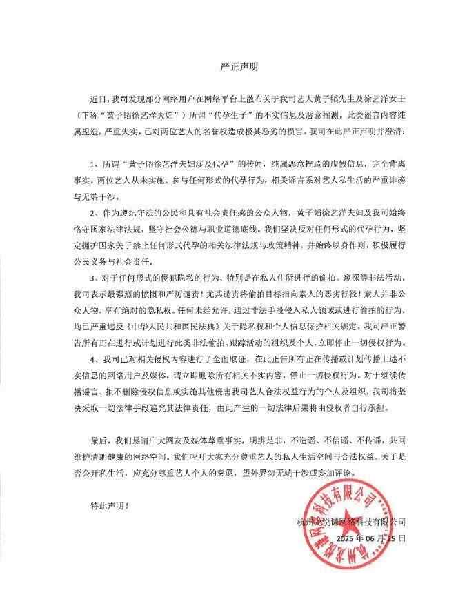 声明提到:近日,我司发现部分网络用户在网络平台上散布关于我司艺人黄子先生及徐艺洋女士(下称“黄子韬徐艺洋夫妇”)所谓“代孕生子”的不实信息及恶意揣测。此类谣言内容纯属捏造,严重失实,已对两位艺人的名誉权造成极其恶劣的损害。