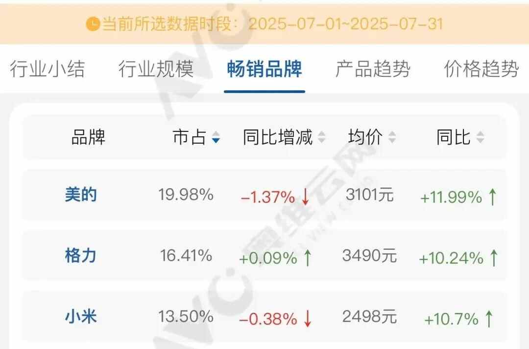 近期,有网友发微博称奥维云网更新了7月份中国空调线上份额数据,称小米已经超越格力,位居第二。该网友贴出的截图显示,7月份小米线上市场份额为16.71%,同比增长2.83%;格力电器为15.22%,同比下降1.1%。
