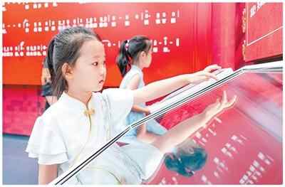 孩子们在百团大战纪念馆展厅内体验数字设备。