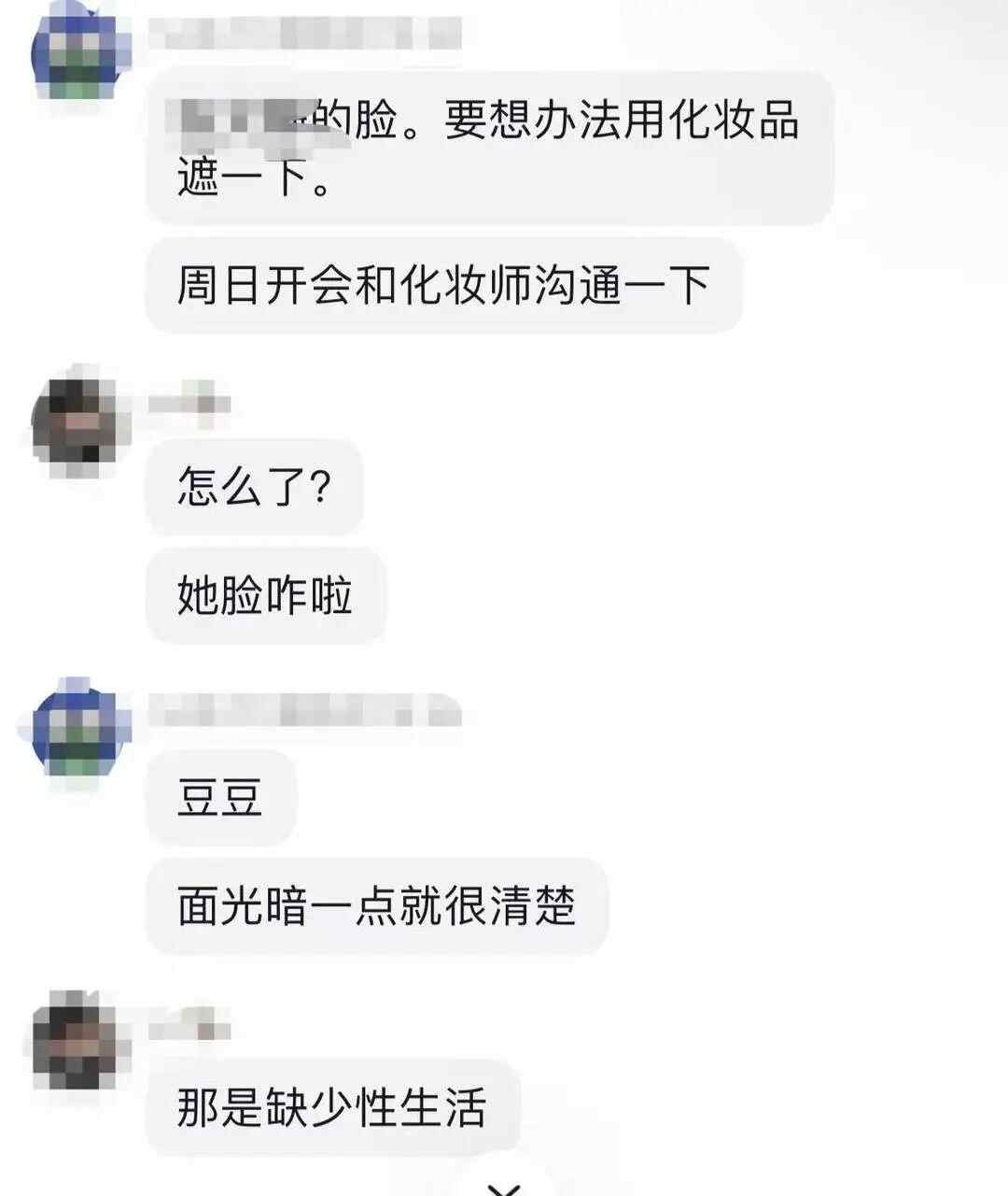 一名成员因脸上有痘,被男运营要求用化妆品遮挡,男负责人yz(群里网名)调侃“那是缺少性生活”;