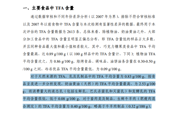 中国食品安全风险评估专家委员会发布的《中国居民反式脂肪酸膳食摄入水平及其风险评估》报告显示,乳及乳制品中天然来源的反式脂肪酸平均含量为0.83克/100克。