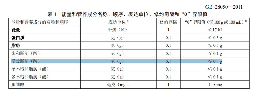 现行食品安全国家标准《预包装食品营养标签通则》里有一个专业术语叫“0”界限值,反式脂肪酸的“0”界限值为每100克或100毫升食品中不超过0.3克。