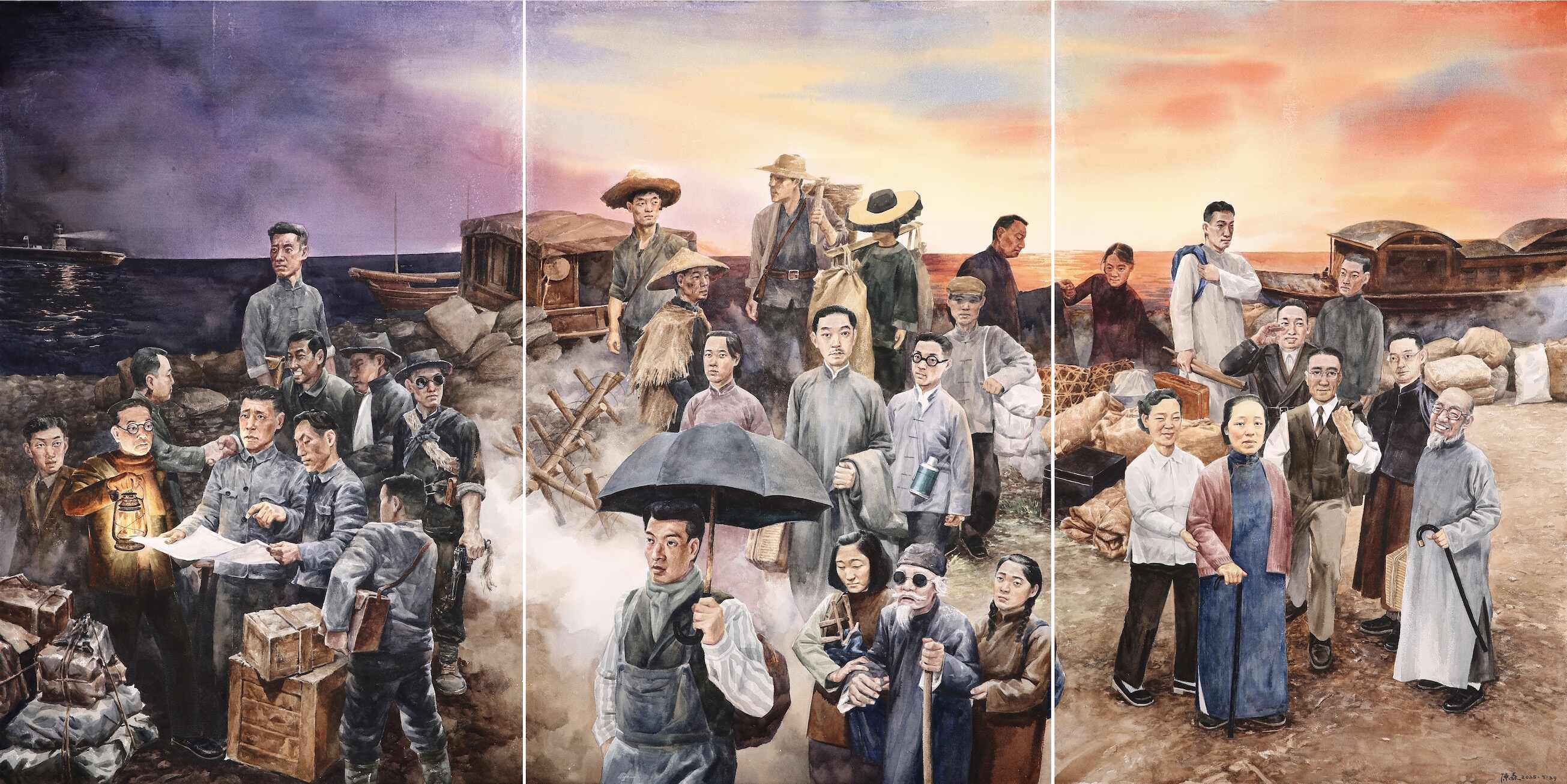 画面右联,天色渐亮,何香凝、柳亚子、夏衍等人的面容上浮现出欣慰的笑意,象征着文化名人胜利抵达大后方的情景。