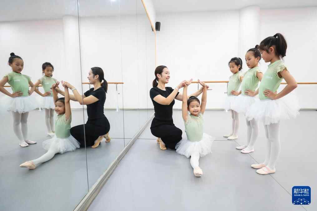 8月24日,在江苏省兴化市一家培训机构,孩子们在舞蹈老师的带领下练习舞蹈动作。