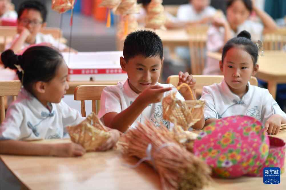 8月24日,小朋友在山东省青岛市城阳区红岛街道宁家社区举办的暑期夏令营活动上学习传统草编。