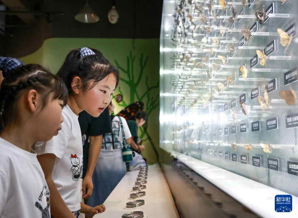 8月23日,小朋友在湖北省武汉科技馆观察昆虫标本。