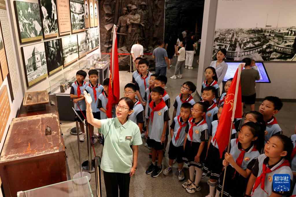8月24日,小学生们在山东枣庄铁道游击队纪念馆听讲解员讲述铁道游击队的故事。