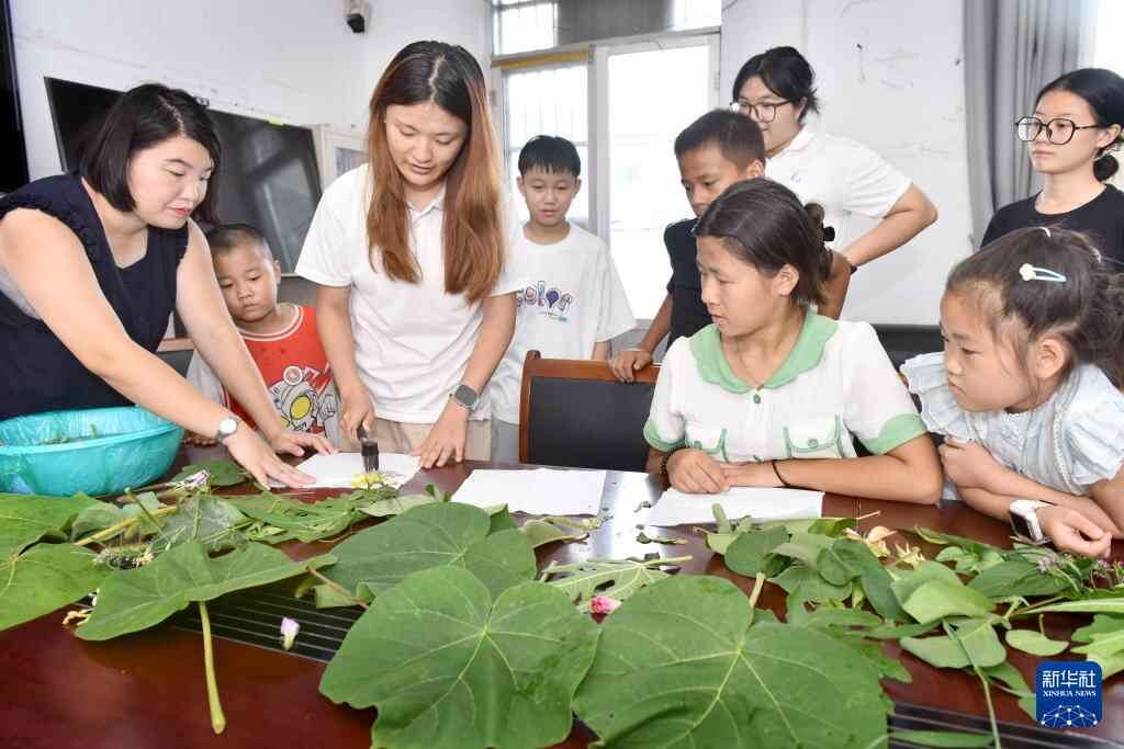 8月24日,在山东省枣庄市山亭区水泉镇板上村,山东理工大学的大学生志愿者(左三)给小朋友示范植物拓印手帕创作。