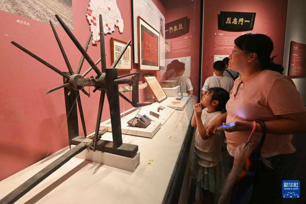 8月24日,家长带着小朋友在山东省青州博物馆观看抗战主题展览。