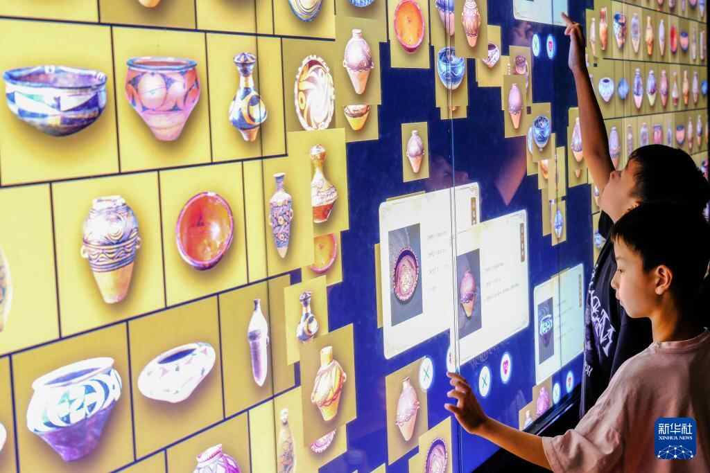 8月20日,在河南省三门峡市渑池县仰韶文化博物馆,小朋友在触摸大屏前参与互动。