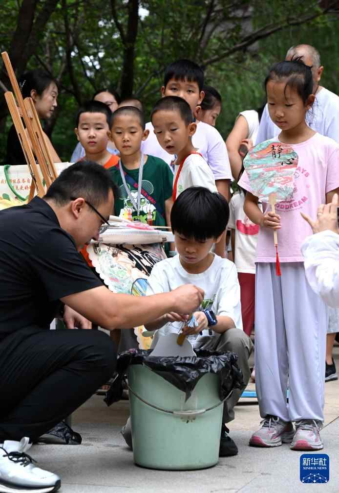 8月23日,在河北省石家庄市新华区星河御城小区,小朋友在社区举办的暑期活动中体验漆扇制作技艺。