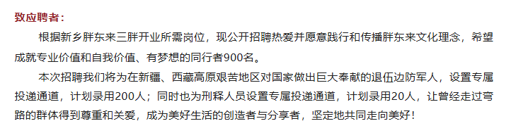 8月18日,胖东来商贸集团发布《新乡胖东来招聘公告》(以下简称《招聘公告》)。《招聘公告》称,希望招聘成就专业价值和自我价值、有梦想的同行者900名。其中将为在新疆、西藏高原艰苦地区的退伍边防军人设置专属投递通道,计划录用200人;同时也为刑释人员设置专属投递通道,计划录用20人。其中,保安、保洁的岗位要求显示,招聘人员需本科及以上学历,年龄25周岁以下(含25周岁)。