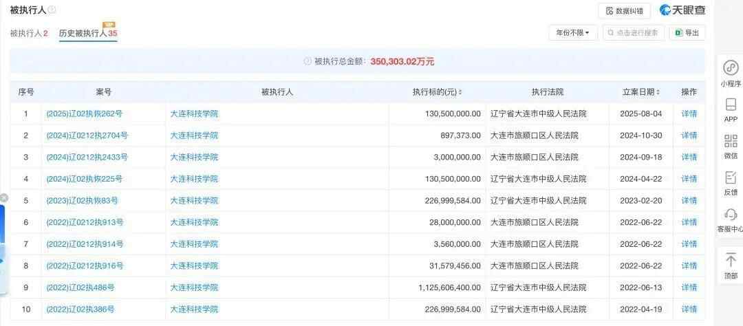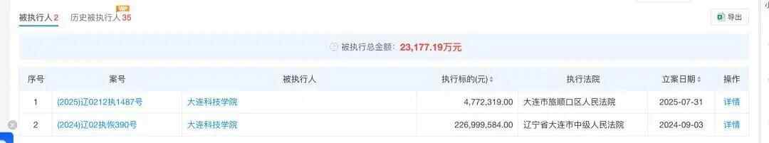 根据天眼查信息显示,大连科技学院共有2条被执行人信息,被执行总金额超2.3亿元;共有35条历史被执行人信息,被执行总金额超35亿元。其中,8月4日新增1则恢复执行信息,执行标的超1.3亿元,执行法院为辽宁省大连市中级人民法院。
