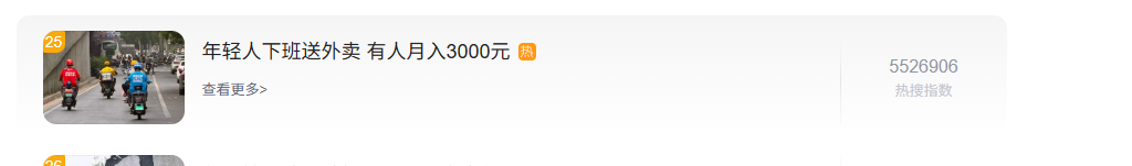 越来越多年轻人开始在下班时间送外卖。今日(25日),“年轻人下班送外卖 有人月入3000元”话题登上百度热搜,引发网友关注。