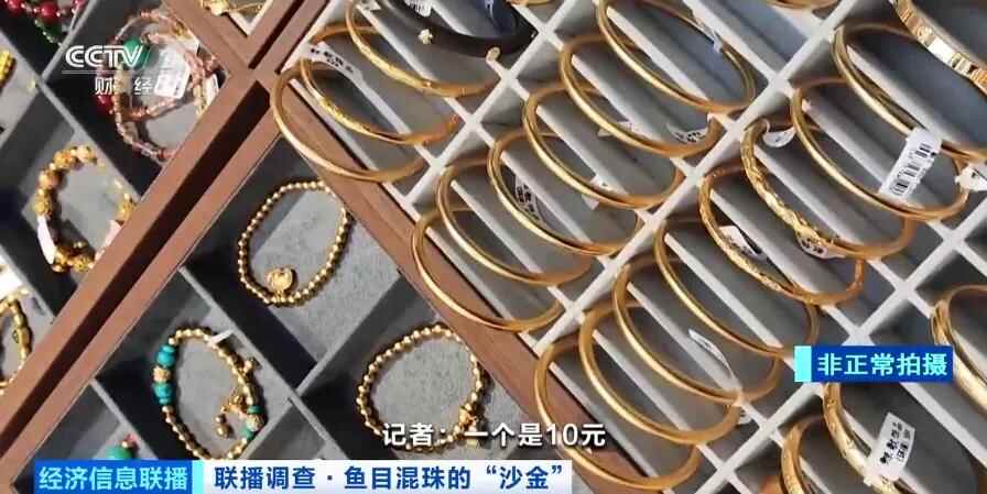 “沙金”的名称,给人一种天然黄金副产品的印象,但实际上,当前市面上销售的绝大多数所谓“沙金”饰品,与黄金并无关系。浙江义乌的商户表示,虽然网上大肆宣传所谓的“沙金”饰品内外一色、火烧后仍然是金色,事实并非如此。