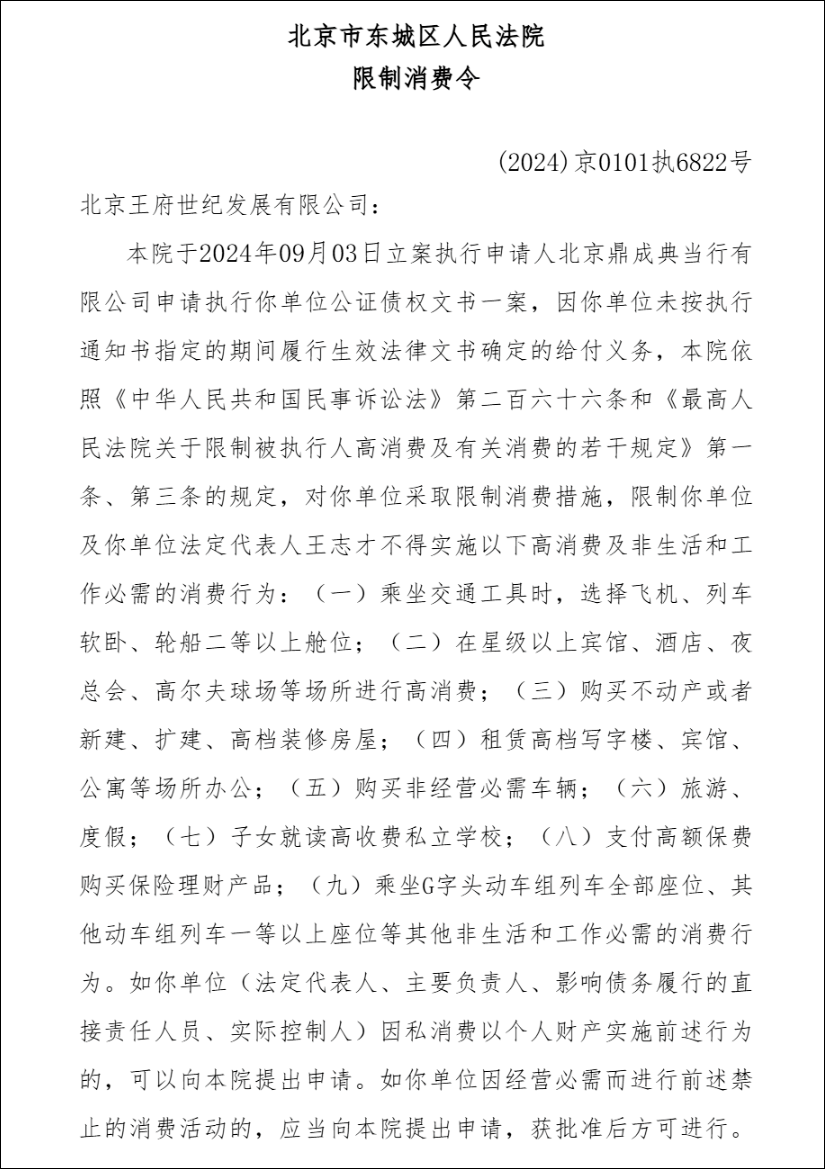 天眼查显示,当前,王志才旗下的北京王府世纪发展有限公司已是被执行人,并且被限制高消费。值得注意的是,申请人中有北京鼎成典当行有限公司。