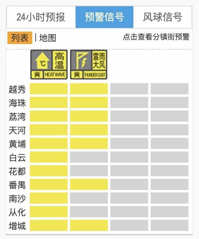 截至8月25日13时35分,广州多区同时发布雷雨大风和高温预警信号,其中越秀、海珠、荔湾、天河、黄埔、番禺、增城发布雷雨大风黄色预警信号;全市各区均维持发布高温黄色预警信号。雷雨大风发生的时间,可能与午休后市民返岗出行时间重合,请留意天气变化。